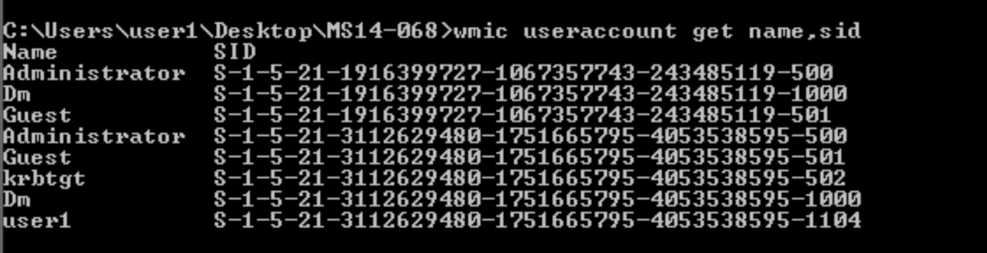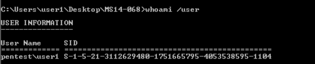 登录用户user1,输入命令,whoami/user。可以看到user1用户的SID为