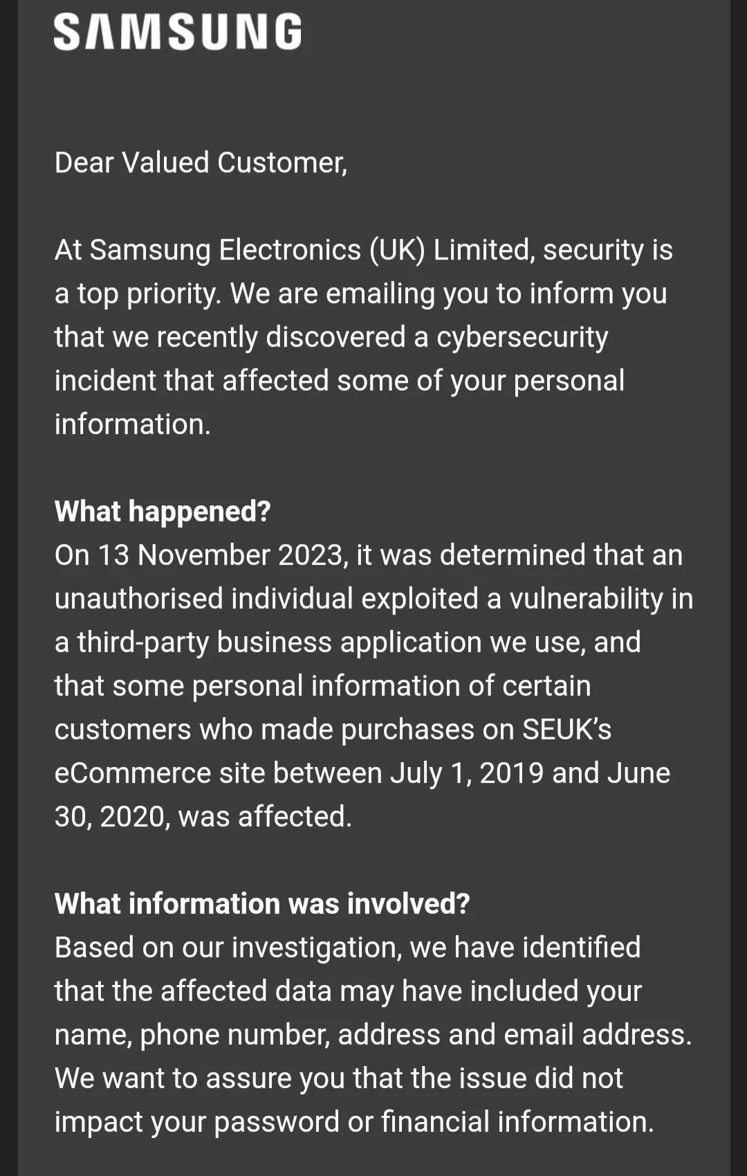 三星在一封发送给客户的电子邮件中详细说明了这起数据泄露事件:“2023年11月13日,我们确认一名未经授权的个人利用我们使用的第三方业务应用程序的漏洞,导致2019年7月1日至2020年6月30日期间一些在SEUK的电子商务网站上购买商品的特定客户的个人信息受到了影响。”