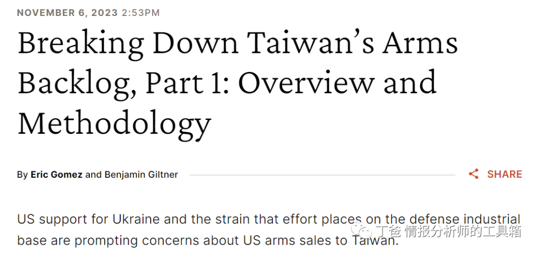 2023年11月,美国卡托研究所埃里克·戈麦斯(Eric Gomez)和本杰明·吉尔特纳(Benjamin Giltner)撰文研究了美国售台湾武器欠交付的情况。该系列报告共有三篇。