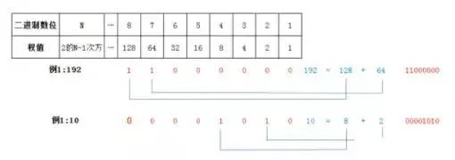 2、把10进制数参照权值进行分解,如:192=128+64,那么对应的第8和第7位为1,其它位为0,转换成二进制:11000000