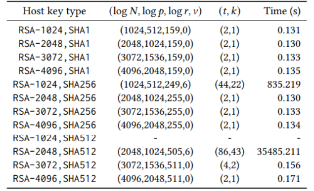 研究人员实验发现其基于格的攻击方法非常高效,成功率可以达到100%。研究人员通过4962个无效签名成功提取出了189个唯一的RSA公钥对应的私钥,但未测试RSA-1024、SHA 512,因为这些算法哈希中的未知位数超出了暴力破解和可以用格计算的范围。