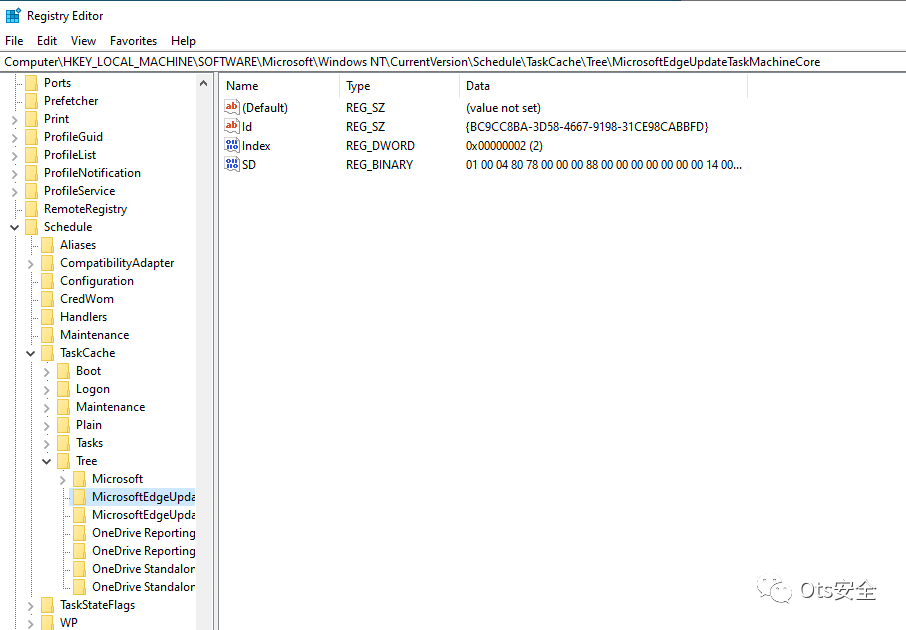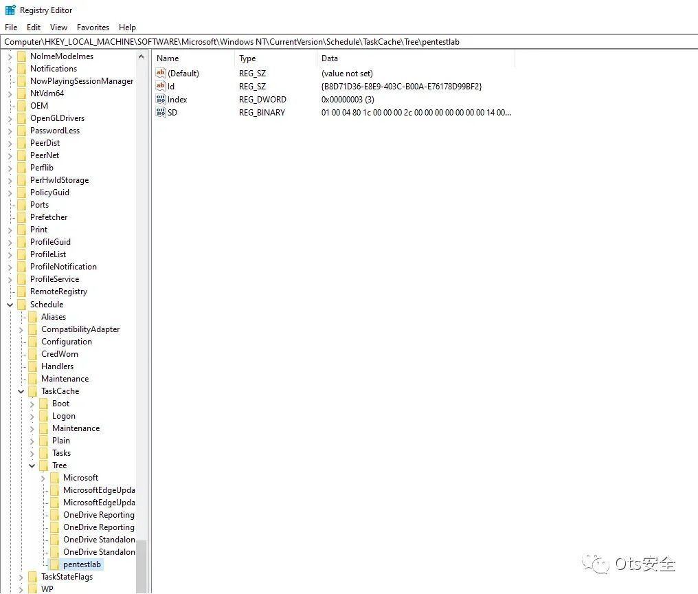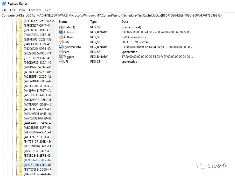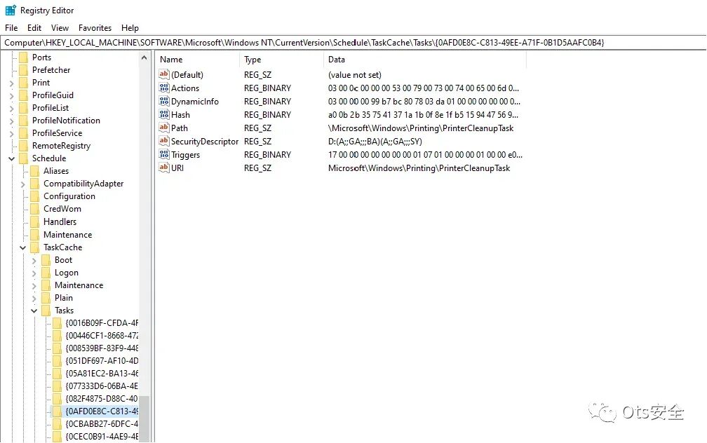 注册表项Tasks包含计划任务的 GUID(映射到 Tree 注册表项的 Id 值)以及运行计划任务所需的其他注册表项,例如: