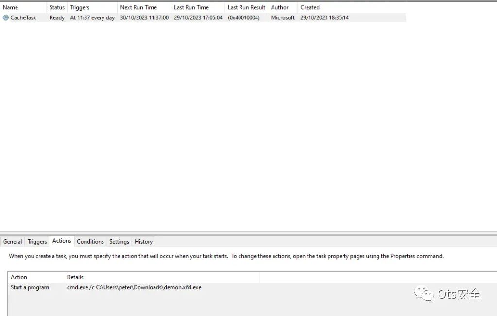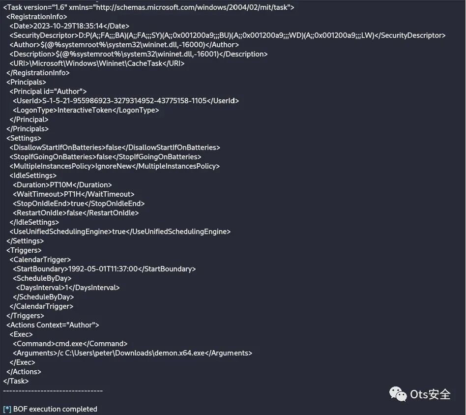 GhostTask 还可用于通过任意信标篡改现有计划任务,以实现更隐蔽的方法。执行以下命令将修改CacheTask,以便每天以特定时间间隔 在用户peter的上下文中执行信标。