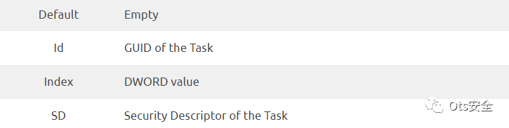 可以重新创建上述注册表项结构以生成新的计划任务。应该注意的是,删除 SD 注册表项将导致任务在任务计划程序中或使用命令schtasks /query时不可见。但是,需要提升权限 (SYSTEM) 才能创建或删除这些注册表项。