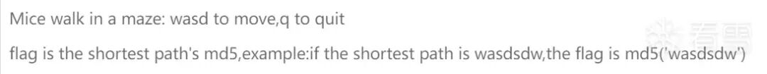 print("flag is the shortest path's md5,example:if the shortest path is wasdsdw,the flag is md5('wasdsdw')")