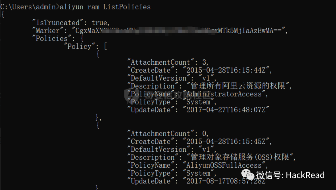 他的PolicyType是System,PolicyName是AdministratorAccess,这个是阿里云默认的,也就是管理所有阿里云资源的权限,其实和cf工具的命令一样,直接接管控制台的命令也是通过这些去调用的,不过云厂商现在研究了cf的特征,导致一用cf调用ak/sk就会产生告警