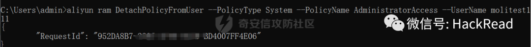 aliyun ram DetachPolicyFromUser --PolicyType System --PolicyName AdministratorAccess --UserName molitest111然后删除用户