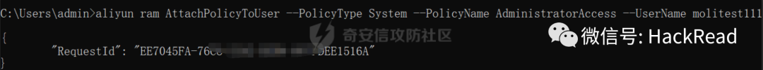 aliyun ram AttachPolicyToUser --PolicyType System --PolicyName AdministratorAccess --UserName molitest111出现下图就是成功了