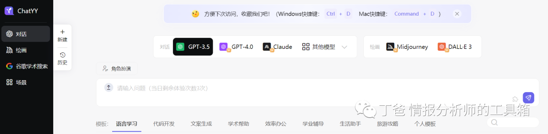 该工具整合了GPT3.5、GPT4.0、Claude等模型能力。拥有对话、绘画、翻译、写作、代码编写等功能。