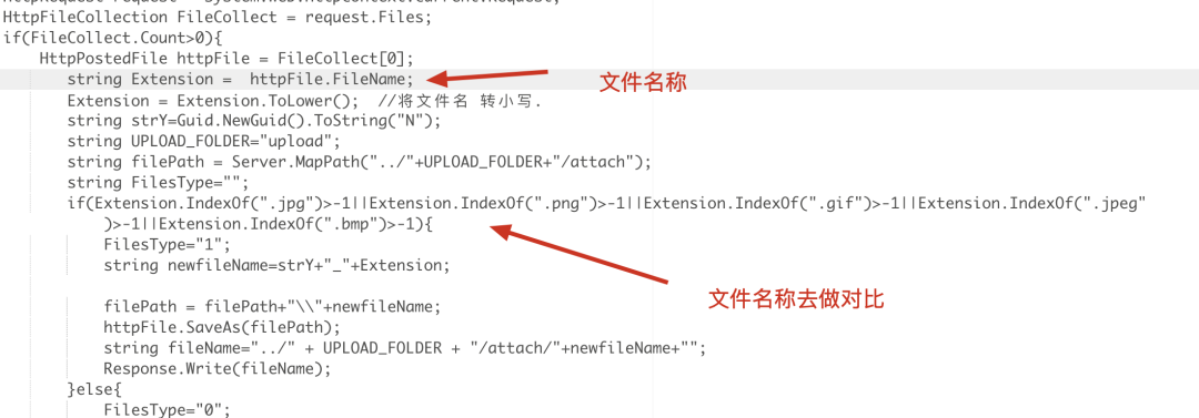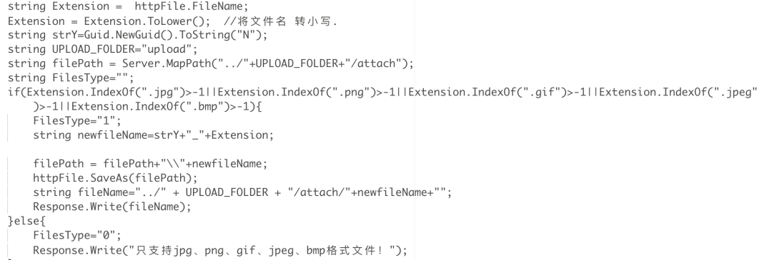 然后又去看了看白名单。这里首先获取文件名--》文件名转成小写,然后通过获取到的文件名去和白名单做对比,如果没有白名单内容则“FilesType”!=1 然后提示只支持白名单文件。