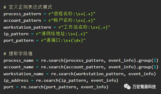 可以利用一些python编程技术,将登录成功的安全日志中的关键字段,如进程名称、账户名称、工作站名称、源网络地址(远程登录IP)、源端口以及时间等数据提取出来保存为excle表格,python的部分核心代码如图所示。