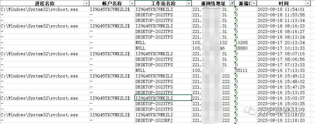 转化完成的日志文件的excle表格如图所示,此时即可很方便对异常登录的IP地址进行分析。