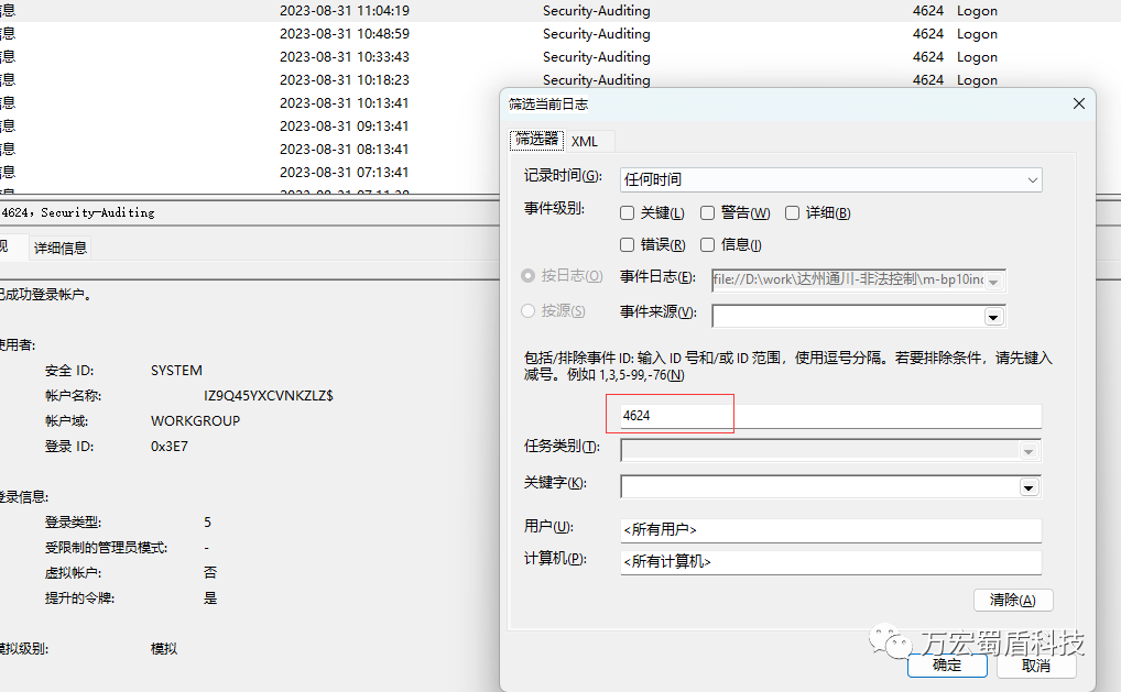 打开“筛选当前日志”后,表示登录记录的事件ID有4个,分别如下: