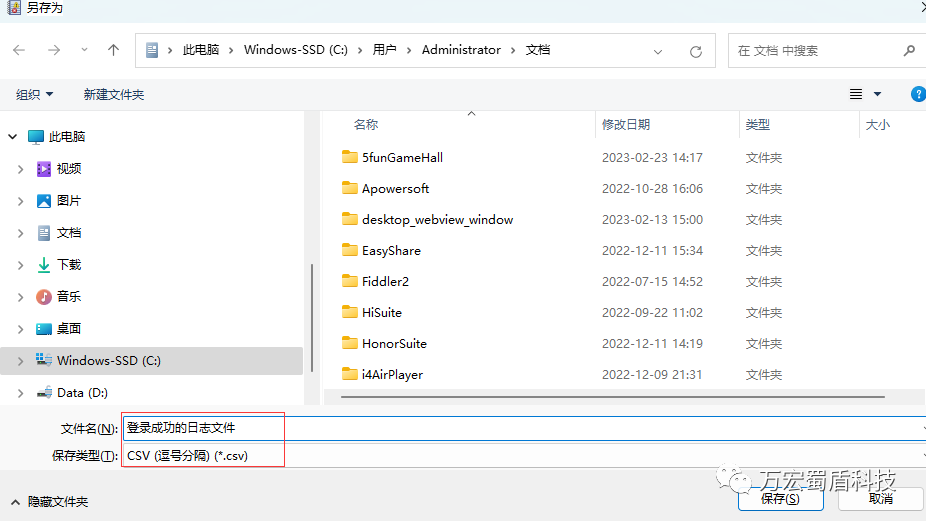 筛查出登录成功的日志记录后,将筛选的日志文件另存为csv格式的文本文件。