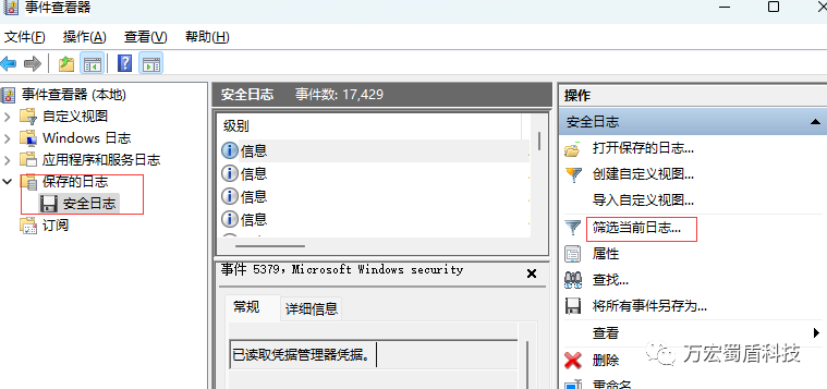 通过“事件查看器”,打开保存的安全日志,再通过“筛选当前日志”的功能,对安全日志进行筛查。