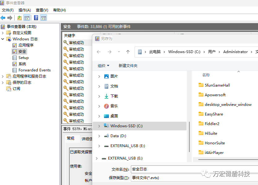 打开Windows自带的“事件查看器”,通过“事件查看器”将安全日志保存到勘验U盘,以便之后导入到取证电脑进行分析。