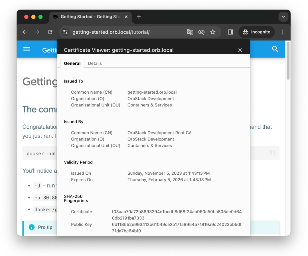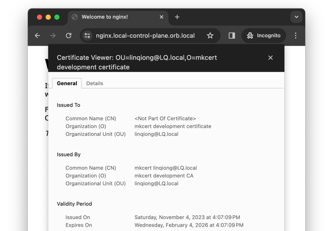 Reminder: X.509 wildcards only go one level deep, so this won't match a.b.local-control-plane.orb.local ℹ️The certificate is at "./_wildcard.local-control-plane.orb.local.pem" and the key at "./_wildcard.local-control-plane.orb.local-key.pem" ✅