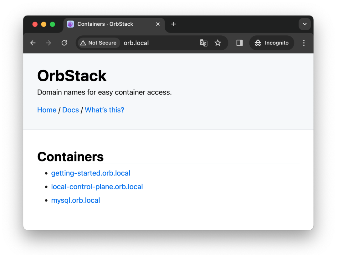 通过访问 http://orb.local 我们可以看到所有正在运行的容器链接。