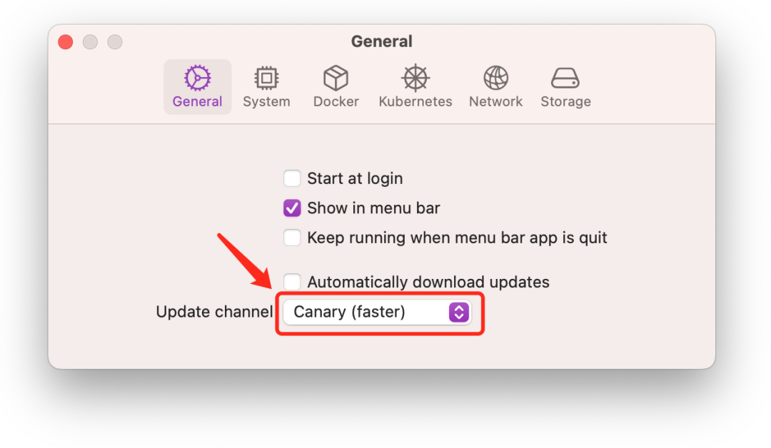 对于那些迫不及待想要体验最新功能的小伙伴们,可以通过以下步骤来抢先体验:进入设置,选择更新通道为 Canary(faster),然后在 OrbStack 菜单中选择检查更新。