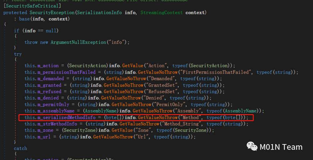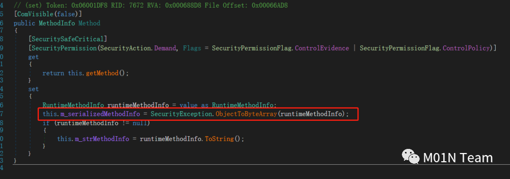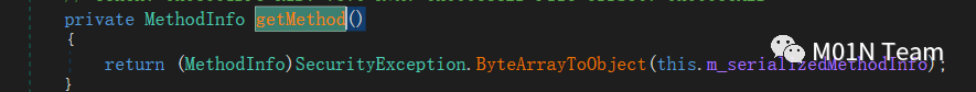 假定应用场景里反序列化器和序列化器都是基于setter/getter,那么反序列化时会触发set_method函数,如下图所示,它会调用SecurityException.ObjectToByteArray把Method传递的值进行二进制序列化,而Mehod已经是序列化一次的,相当于现在m_serializedMethodInfo储存的是两次序列化后的结果。接着序列化调用get_Method,会把m_serializedMethodInfo做一次反序列化,整个过程结束,Method值相当于根本没改变,并没有被反序列化。
