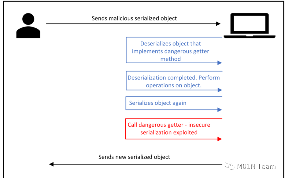 设想有这样一种应用场景,服务端接收序列化的字符串,反序列化为对象obj后,对obj进行修改,然后再序列化,发给客户端。那么可以利用的点如图所示。传递给服务器一个序列化对象,这个对象包含了恶意的getter,反序列化会正常进行,不会执行恶意操作,但当再次序列化时,便会触发getter的调用,从而造成恶意操作的执行。当然,这种场景下使用的formater都是基于setter、getter的,如Json.Net,而BinaryFormatter、SoapFormatter等不属于。这种利用方式与以往是不同的,通常反序列化链在反序列化时就触发了恶意操作,而此种利用方式是在序列化时触发恶意操作。