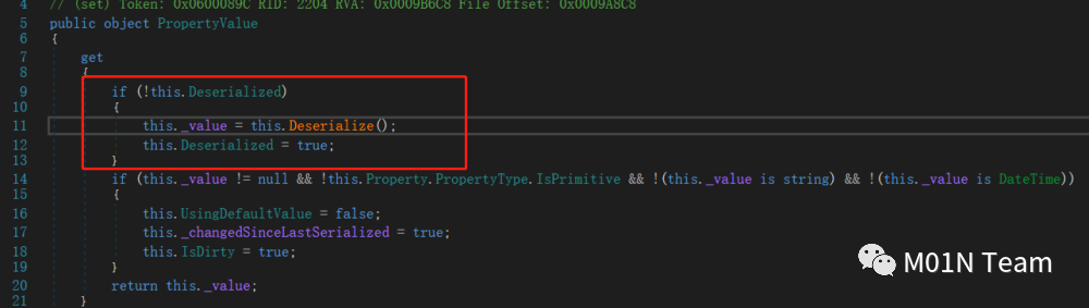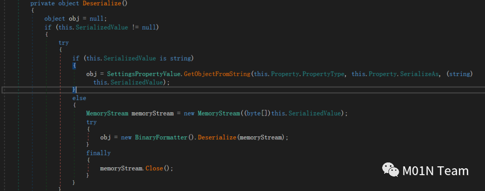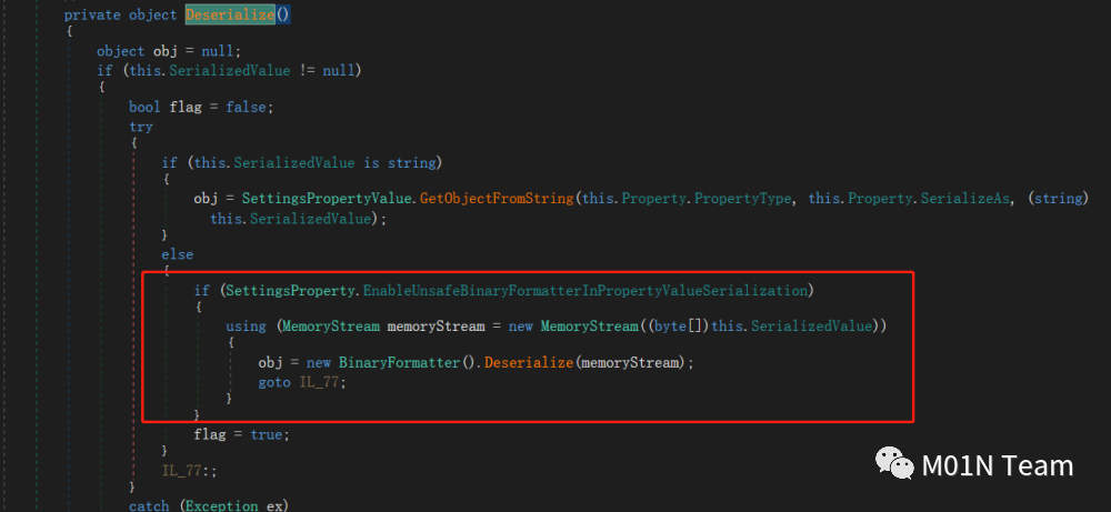 该类 get_PropertyValue 方法在特定条件下会调用BinaryFormater.Deserialize(),而这个特定条件用户可以控制满足,因此可以调用任意binaryformater的gadget链。