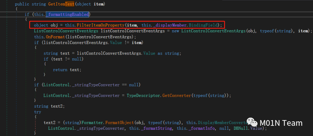 GetItemText会调用FilterItemOnProperty,这个函数会从触发我们设置的DisplayMember字段对应的getter。
