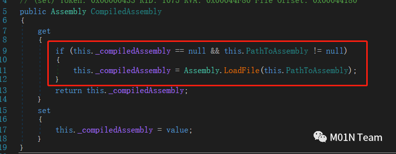 该类 get_CompiledAssembly 会导致任意dll的远程加载。需要注意的是,Assembly.LoadFile在 .NET Framework 4以后默认禁止远程加载,而.net 5以上是可以的。加载的dll可以是assembly,也可以是native Dll。虽然nativedll中dllmain中代码会执行,但是加载nativedll会报PE格式错误。