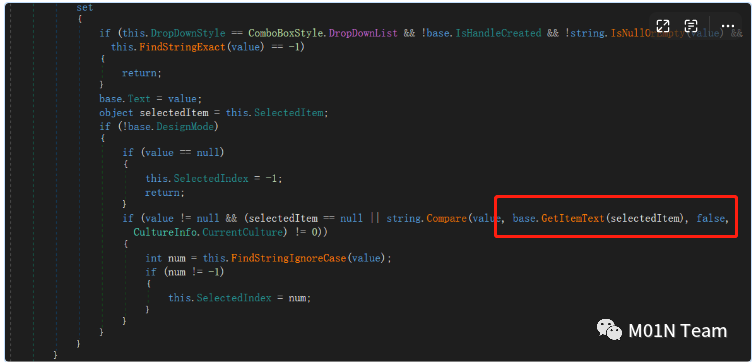 set_Text如下,第一个if判断会直接为true,具体查看ComboBox构造函数。走到红框处调用 ListControl.GetItemText ,其参数selectedItem是 Items 中的对象。