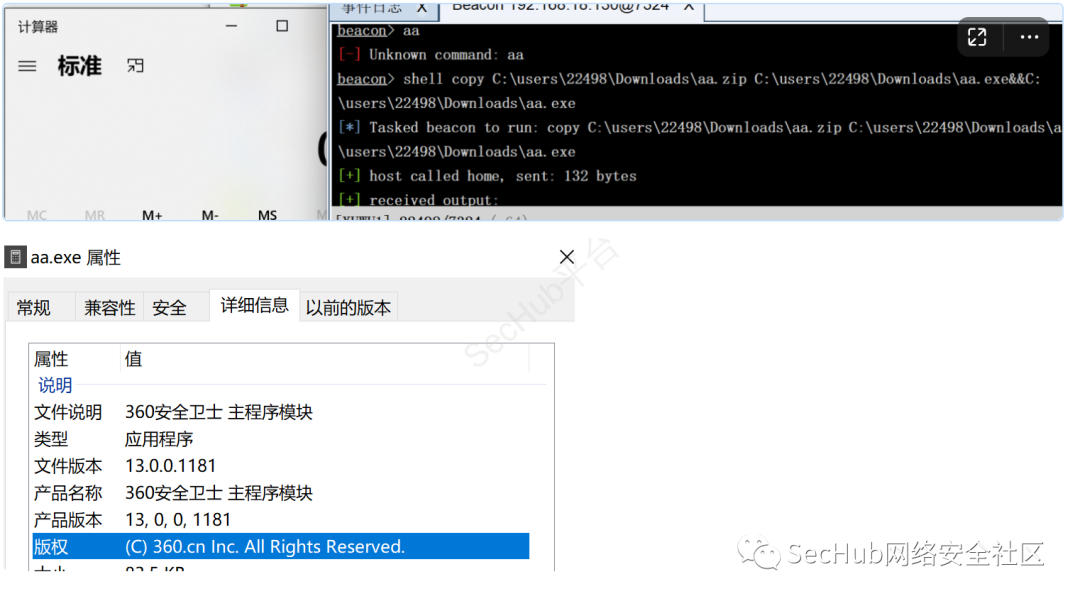 成功弹出计算机,这里的计算机程序我已经更改了它内部信息,360不会把他当做白名单calc的,可以看作为一个免杀马吧