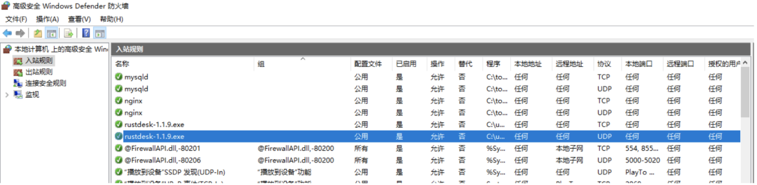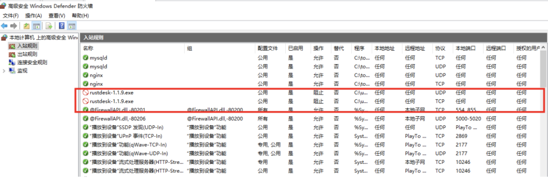 如果不允许,防火墙的入站规则默认禁止,这时候因为不联网的问题(纯内网环境下),RustDesk就无法远程连接(当然我们也不可能让它允许访问)