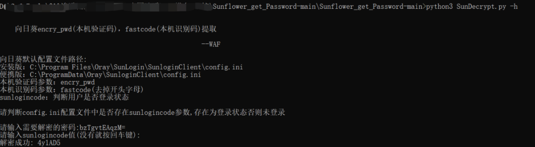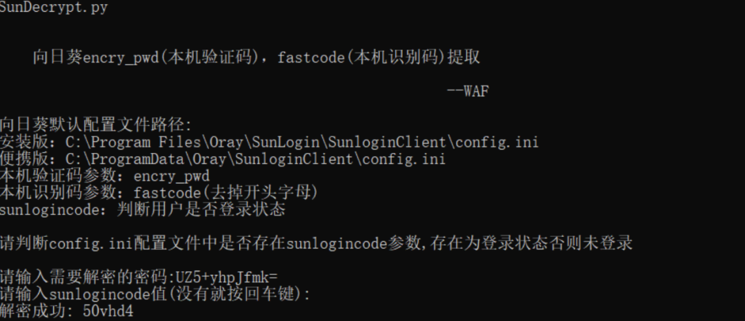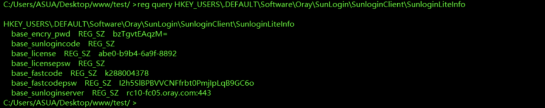 通过配置文件获取:安装版:C:\Program Files\Oray\SunLogin\SunloginClient\config.ini便携版(绿色版):C:\ProgramData\Oray\SunloginClient\config.ini简约版(绿色版):C:\ProgramData\Oray\SunloginClientLite\config.ini注册表查询:reg query HKEY_USERS\.DEFAULT\Software\Oray\SunLogin\SunloginClient\SunloginInforeg query HKEY_USERS\.DEFAULT\Software\Oray\SunLogin\SunloginClient\SunloginGreenInforeg query HKEY_USERS\.DEFAULT\Software\Oray\SunLogin\SunloginClient\SunloginLiteInfo