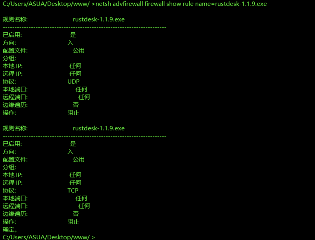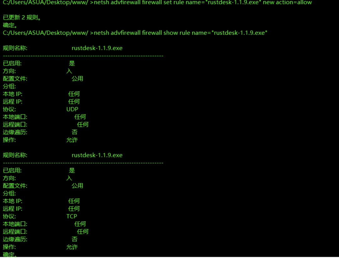 netsh advfirewall firewall show rule name=rustdesk-1.1.9.exe