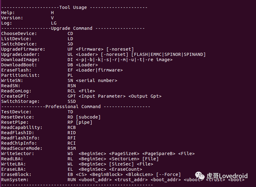 $ upgrade_tool UF ~/Downloads/update.imgupgrade_tool -h查看工具使用方法。