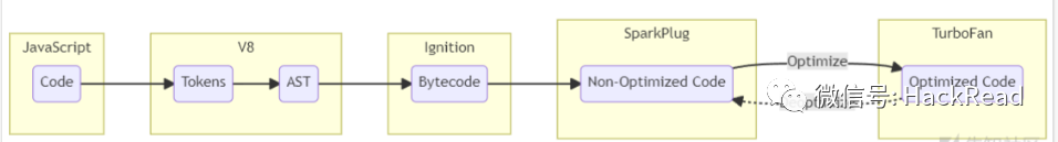 在CVE-2018-17463这一版本中并没有这一阶段,Sparkplug是在V8 9.1版本中引入的非优化JS编译器,它位于Ignition和Turbofan之间,用于产生未经优化的机器码。