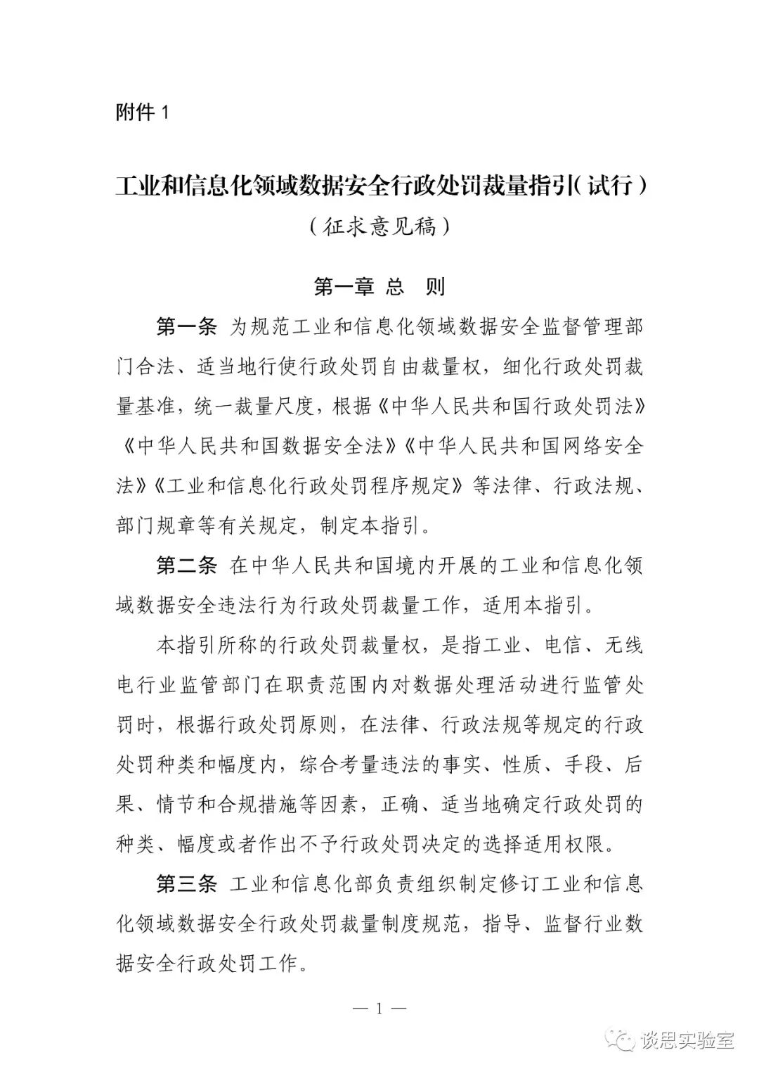 为贯彻落实《数据安全法》《工业和信息化领域数据安全管理办法(试行)》,推动工业和信息化领域数据安全行政处罚工作制度化、规范化开展,工业和信息化部网络安全管理局研究起草了《工业和信息化领域数据安全行政处罚裁量指引(试行)》,现向社会公开征求意见。