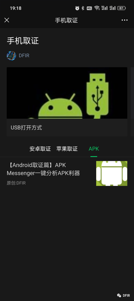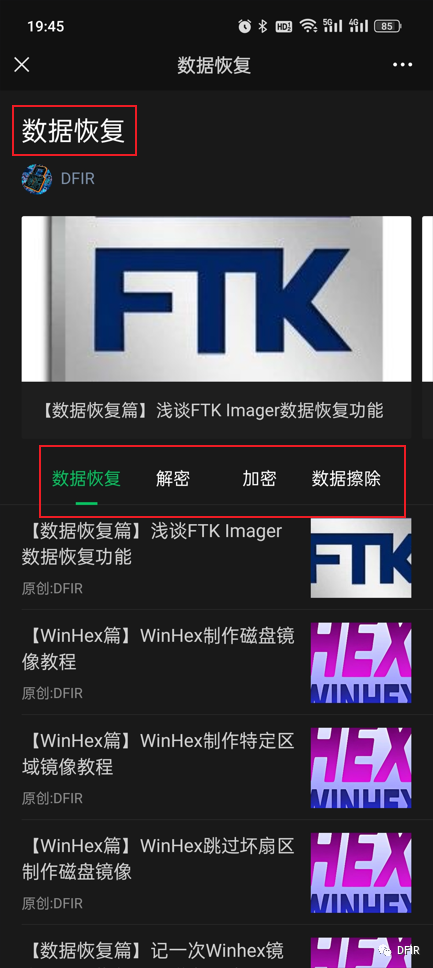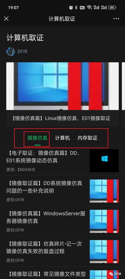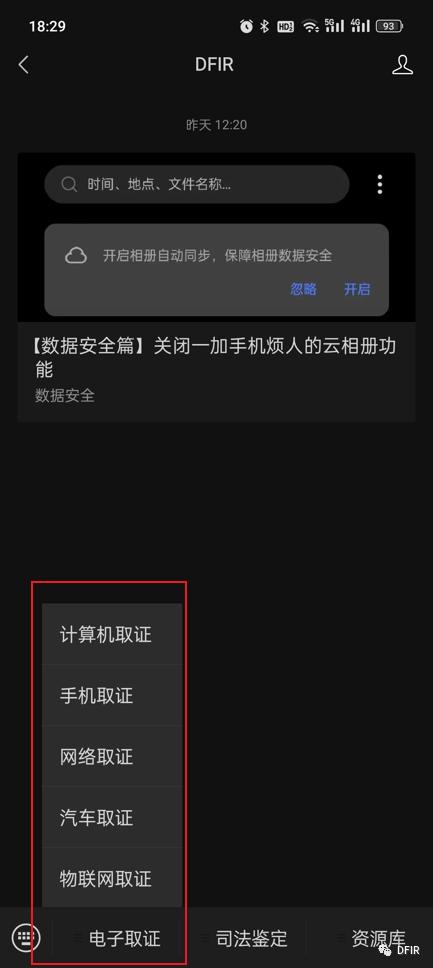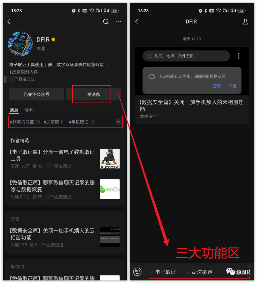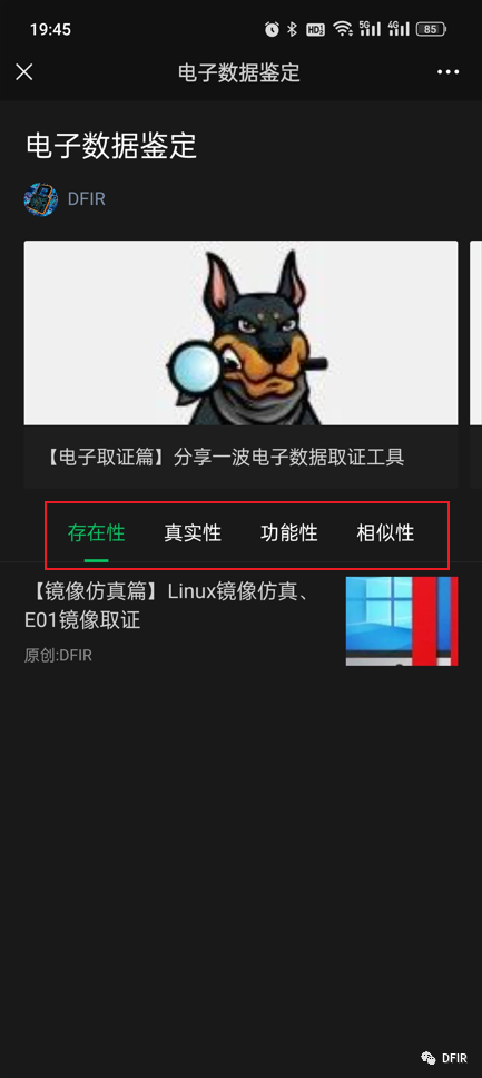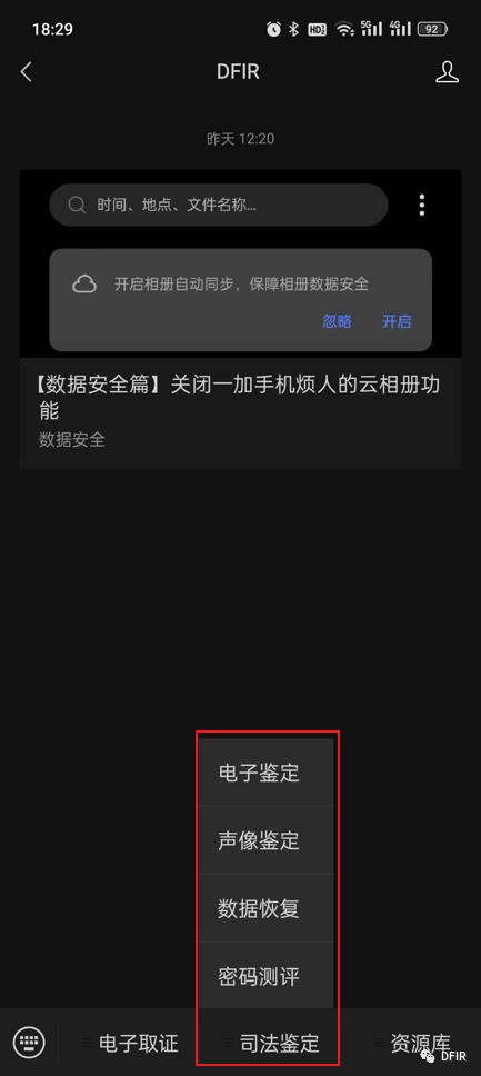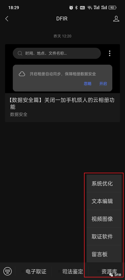 点击【发消息】按钮,会进入到DFIR公众号的主页面,这里面目前主要分为三大模块【电子取证】、【司法鉴定】、【资源库】,在这三大模块可以查询到对应历史文章的记录。下面简单介绍各个模块的内容。