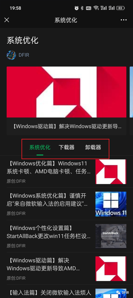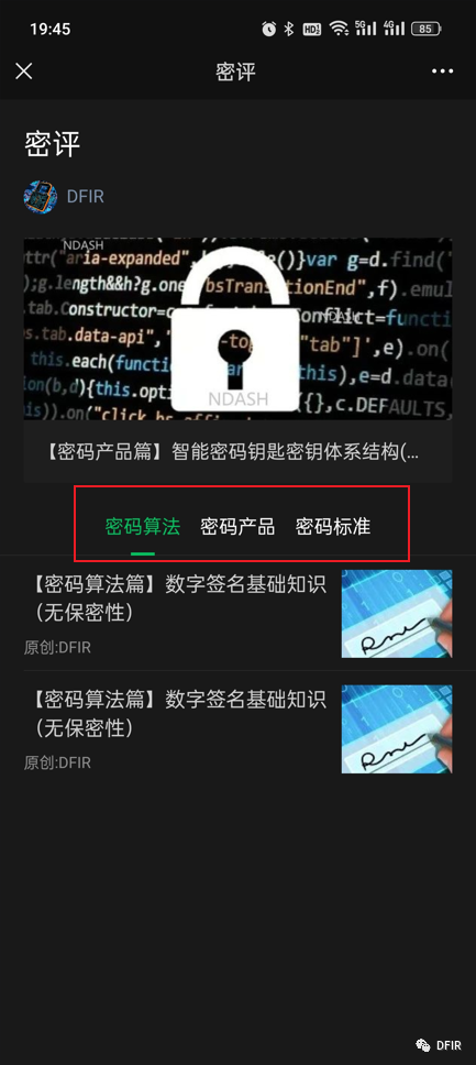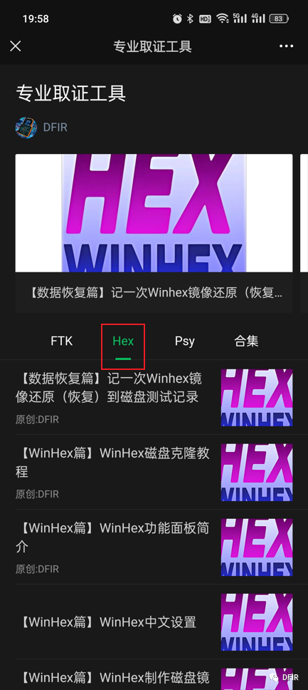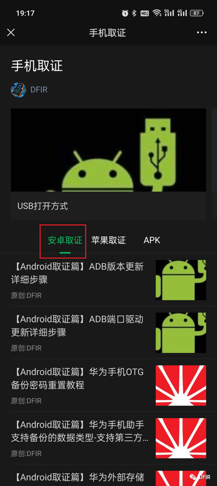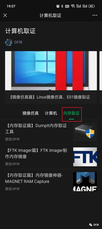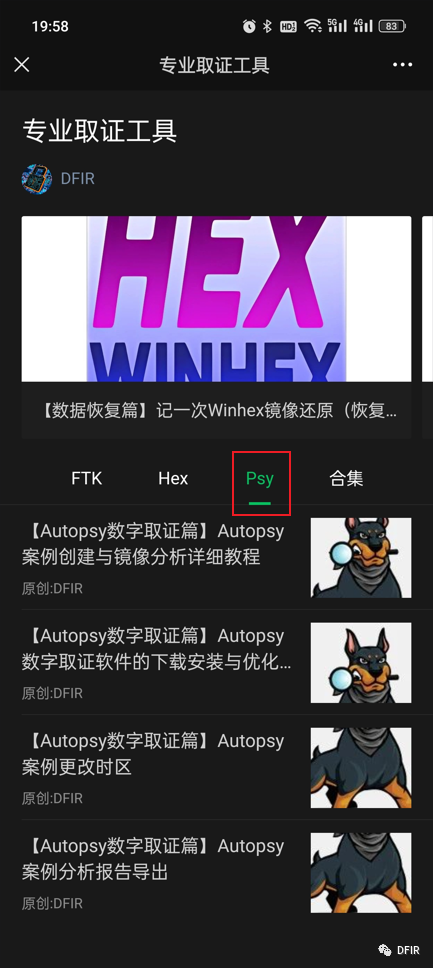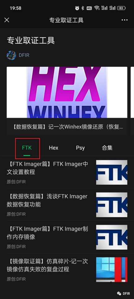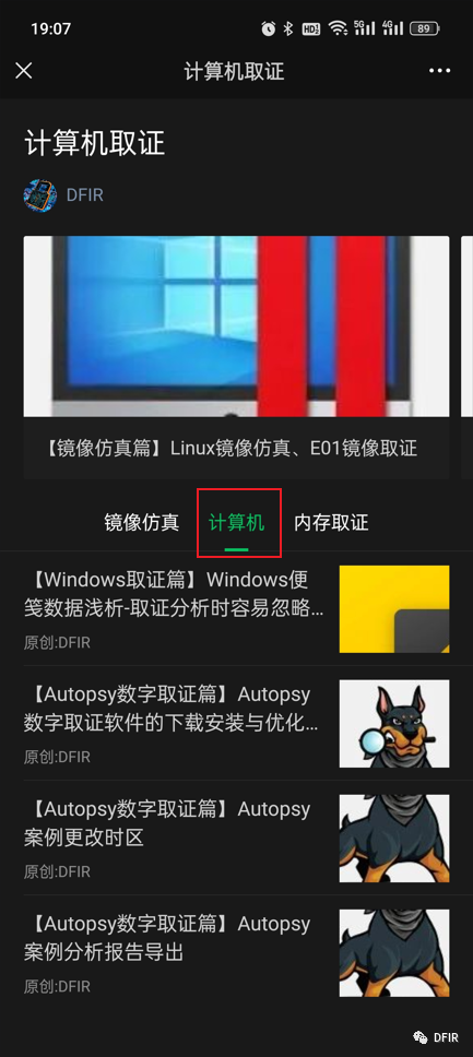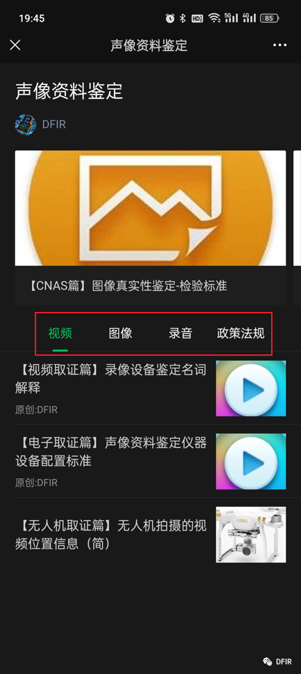 点击【发消息】按钮,会进入到DFIR公众号的主页面,这里面目前主要分为三大模块【电子取证】、【司法鉴定】、【资源库】,在这三大模块可以查询到对应历史文章的记录。下面简单介绍各个模块的内容。