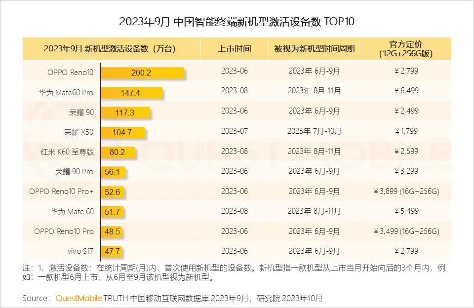 好看好拿也要好用在 QuestMobile 的 2023 中国移动互联网秋季报告里,OPPO Reno10 系列是 9 月激活数最多的设备之一,仅一个月就有超过 300 万台手机被激活,是国产手机 2