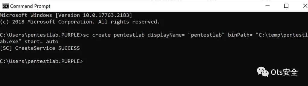 服务配置实用程序可用于创建新服务。“ binPath ”参数可以存储服务启动后将执行的任意有效负载。需要注意的是,由于服务控制管理器的权限发生了变化,非提升用户也可以在windows环境上创建新的服务。如果蓝队删除了恶意服务,权限仍将保留,允许标准用户继续创建新服务以保持持久性。