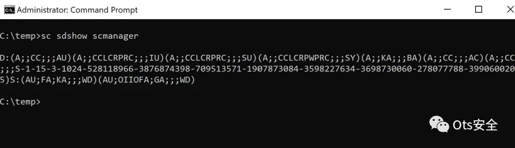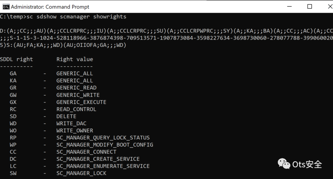 下面的命令将枚举“ scmanager ”实用程序的权限并显示关联的 SDDL 权限。